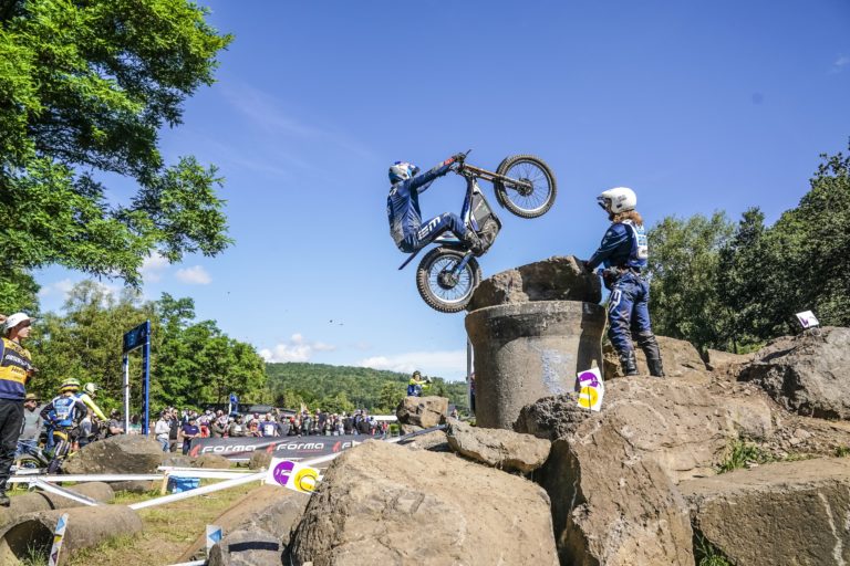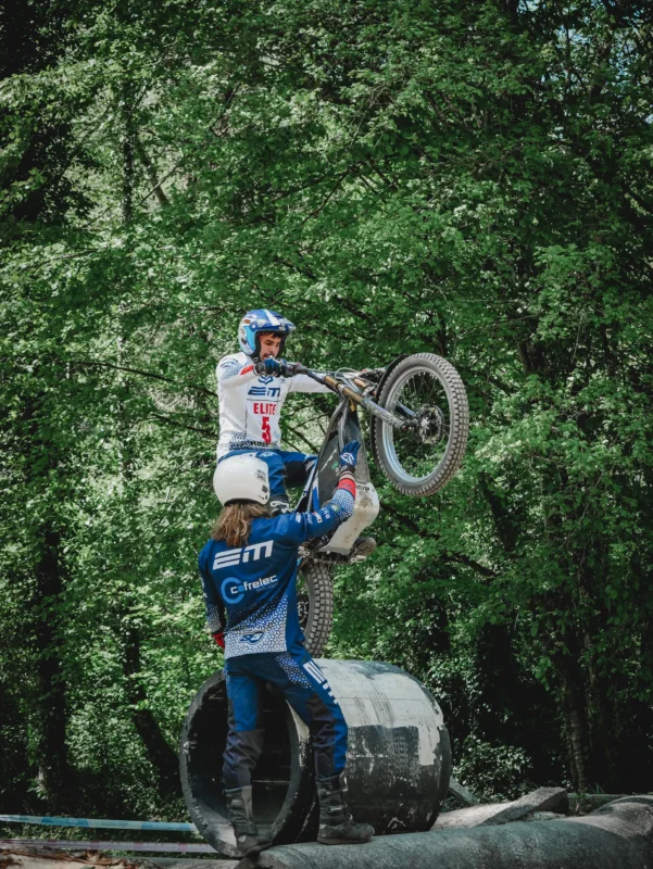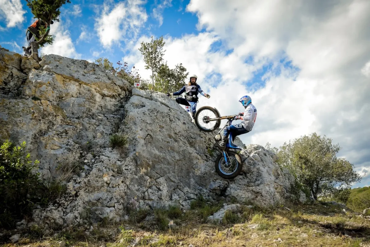 Trial-Sektionen mit klaren Stufen und Hindernissen, Präzision ist entscheidend, und das Motorrad wird dynamisch und reaktiv. - Gang (Natural Trial):
